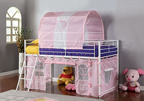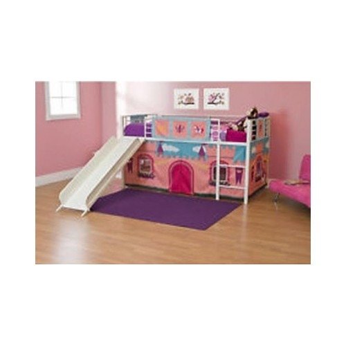 Oates lofted bed with slide and tent; Buy our white castle low loft bed with pink tent by donco trading kids bedroom furniture ☆ white slide bed with pink curtains for girls at kids furniture . Bed assembly features barrel nut and bolt construction; Castle tent twin metal loft bed with; Take a quick tour of this pretty pink slide bed!